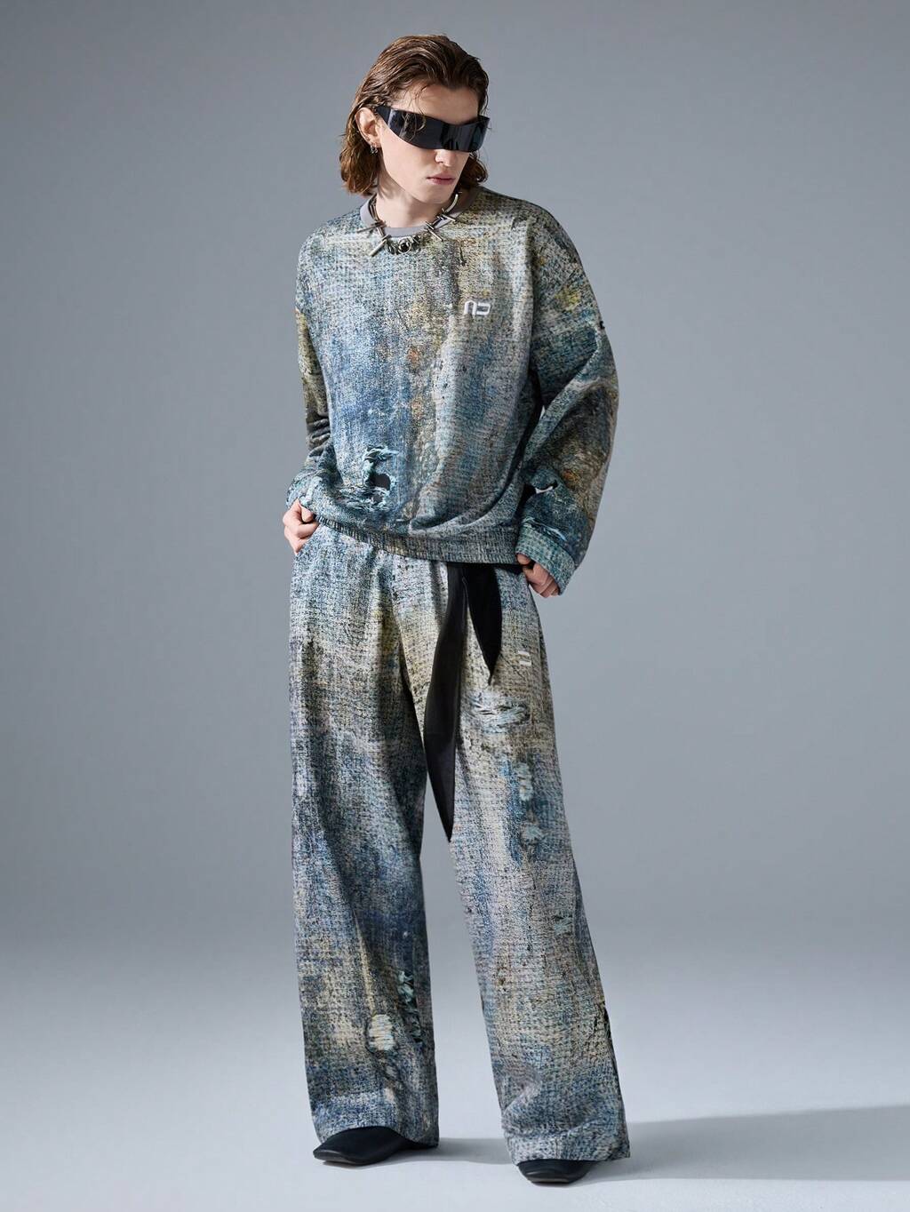 Men's Street Style Letter Print Distressed Crew Neck Long Sleeve Pullover Sweatshirt, For Fall Winter