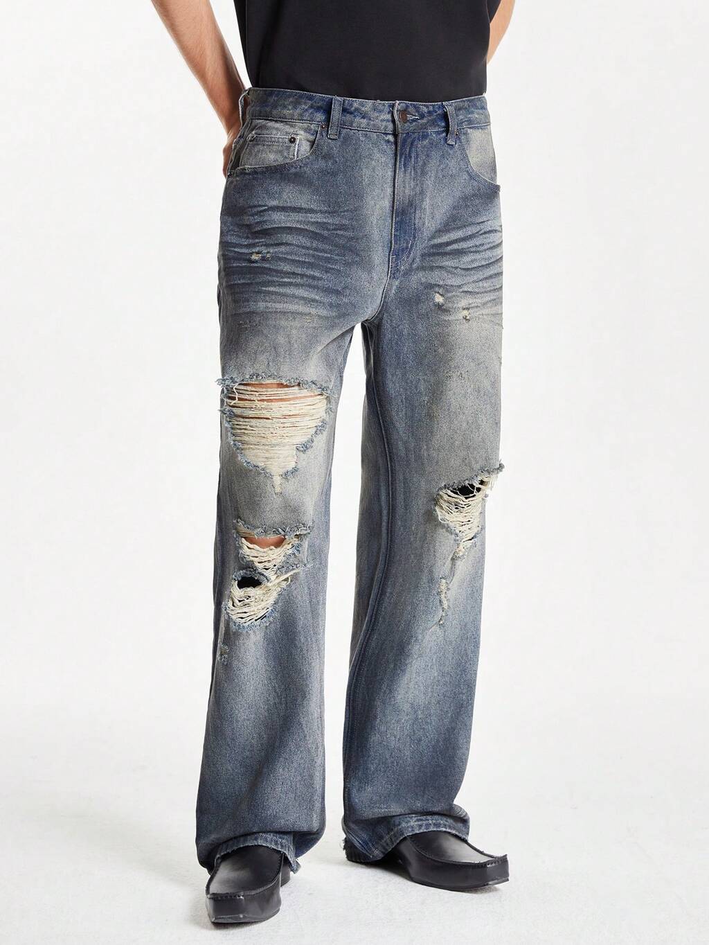 Men's Light Blue Distressed Wide-Leg Straight Jeans