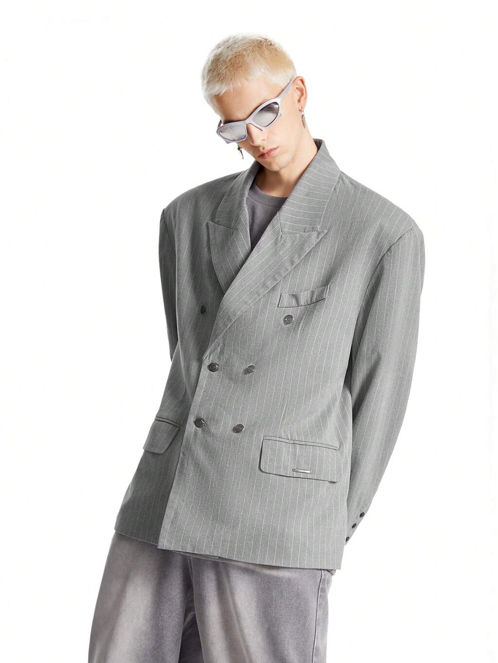 Men's Casual Striped Loose-Fit Double-Breasted Blazer Jacket, Suitable For Autumn & Winter